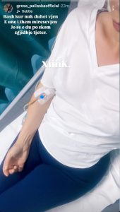 Ajo ka ndarë një imazh nga krevati i spitalit, ku shihet me serum në dorë, duke treguar se gjendja është pasojë e një viroze që nuk ka mundur ta kalojë pa ndihmën mjekësore.