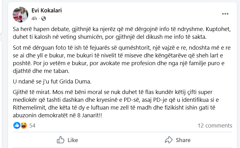 “Mos më bëni moral që flas për një çift mediokër që tani dashkan dhe kryesinë e PD-së, ndërkohë që në 8 janar ishin fizikisht gati të abuzonin demokratët.”