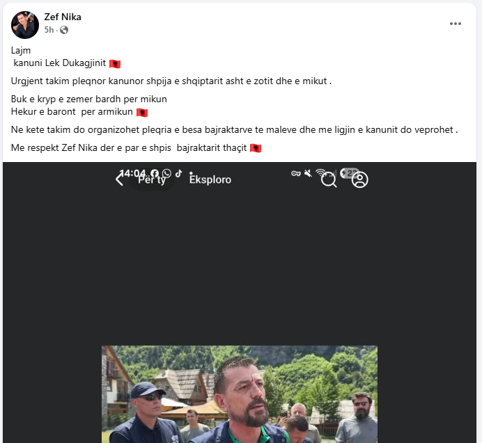 Një thirrje urgjente dhe solemne është lëshuar nga Zef Nika, dera e parë e shtëpisë së bajraktarit të Thaçit, për një mbledhje pleqnore të jashtëzakonshme, në bazë të Kanunit të Lekë Dukagjinit, si reagim ndaj aksionit të qeverisë për prishjen e bujtinave në Theth dhe përplasjeve të rënda mes banorëve dhe forcave shtetërore.