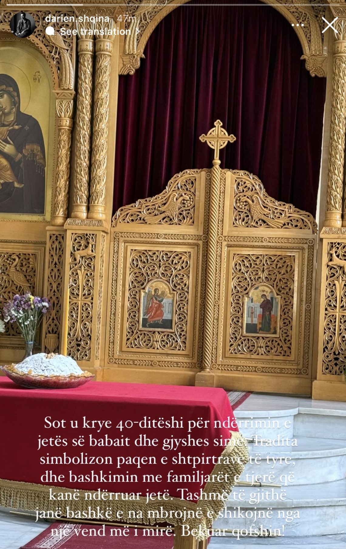 “Sot u krye 40-ditëshi për ndërrimin e jetës së babait dhe gjyshes sime. Tradita simbolizon paqen e shpirtrave të tyre dhe bashkimin me familjarët e tjerë që kanë ndërruar jetë. Tashmë të gjithë janë bashkë, na mbrojnë dhe na shikojnë nga një vend më i mirë. Bekuar qofshin!”, – shkruan Darien, duke shprehur një ndjenjë të thellë humbjeje, por edhe shprese për prehjen shpirtërore të më të dashurve të tij.