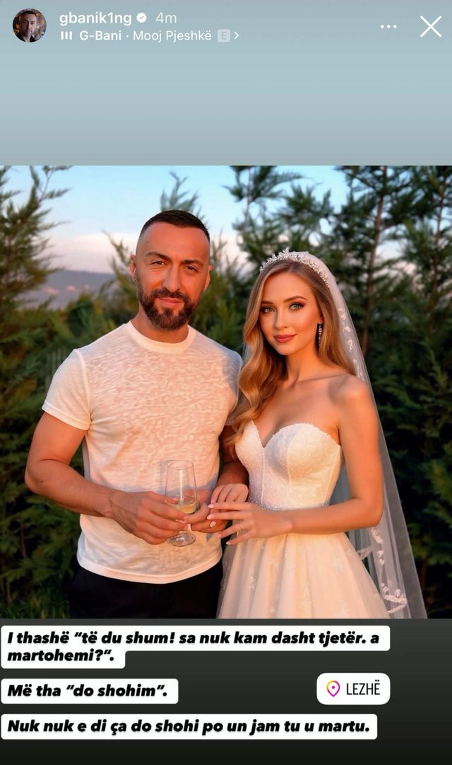 Në foton e postuar në Instagram Story, G-Bani shfaqet krah një vajze të veshur me fustan të bardhë nusërie, të dy me gotat e shampanjës në dorë, buzëqeshje dhe një atmosferë tipike dasmeje. Por më shumë se vetë imazhi, ishte përshkrimi i shoqëruar me të, që ngriti temperaturën në rrjet: