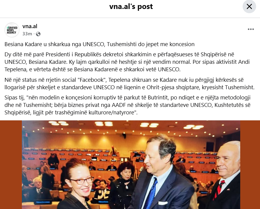 Në mënyrë të heshtur, Presidenti i Republikës dekretoi pak ditë më parë largimin nga detyra të përfaqësueses së Shqipërisë në UNESCO, Besiana Kadare. Por sipas aktivistit Andi Tepelena, kjo nuk ishte thjesht një vendimmarrje formale nga Tirana – Kadare është shkarkuar realisht nga vetë UNESCO, pasi nuk ka dhënë llogari për shkeljet e rënda të standardeve të mbrojtjes në pjesën shqiptare të Liqenit të Ohrit, konkretisht në Tushemisht.