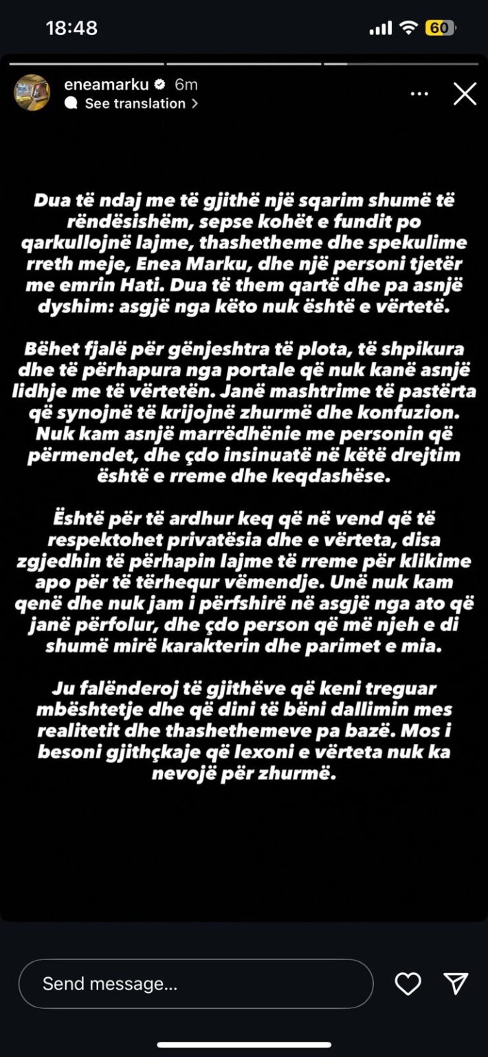 Dua të ndaj me të gjithë një sqarim shumë të rëndësishëm, sepse kohët e fundit po qarkullojnë lajme, thashetheme dhe spekulime rreth meje, Enea Marku, dhe një personi tjetër me emrin Hati. Dua të them qartë dhe pa asnjë dyshim: asgjë nga këto nuk është e vërtetë,” shkruan ai.
