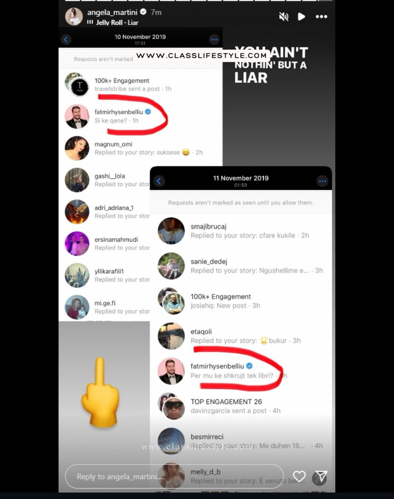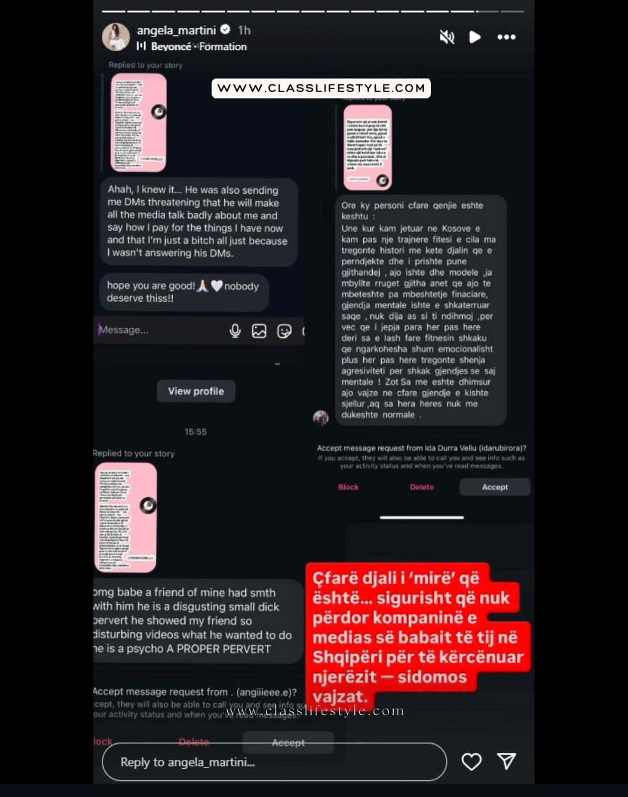 Përplasja publike mes Angela Martinit dhe Fatmir Hysenbelliut është kthyer në një debat të hapur me akuza dhe kundërpërgjigje të forta. Modelja publikon mesazhe dhe dëshmi nga vajza të tjera, ndërsa biznesmeni i përgjigjet me mohim dhe akuza për manipulim dhe interes personal. Situata pritet të vijojë të marrë vëmendje, me mundësi që të ketë zhvillime të tjera ligjore dhe mediatike.