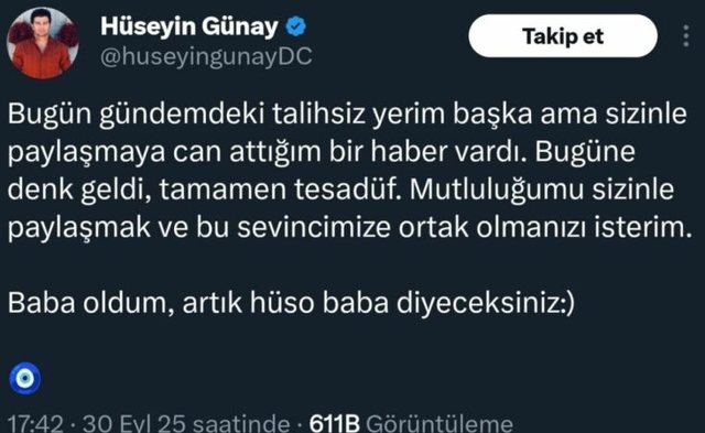 “Sot kam fatin e keq të jem në një pozicion ndryshe në agjendë, por ka një lajm që mezi prisja ta ndaja me ju, sepse dua të ndjeni gëzimin tim: U bëra baba. Që tani e tutje, do të më thërrisni Hüso Baba.”, tha Gunay.