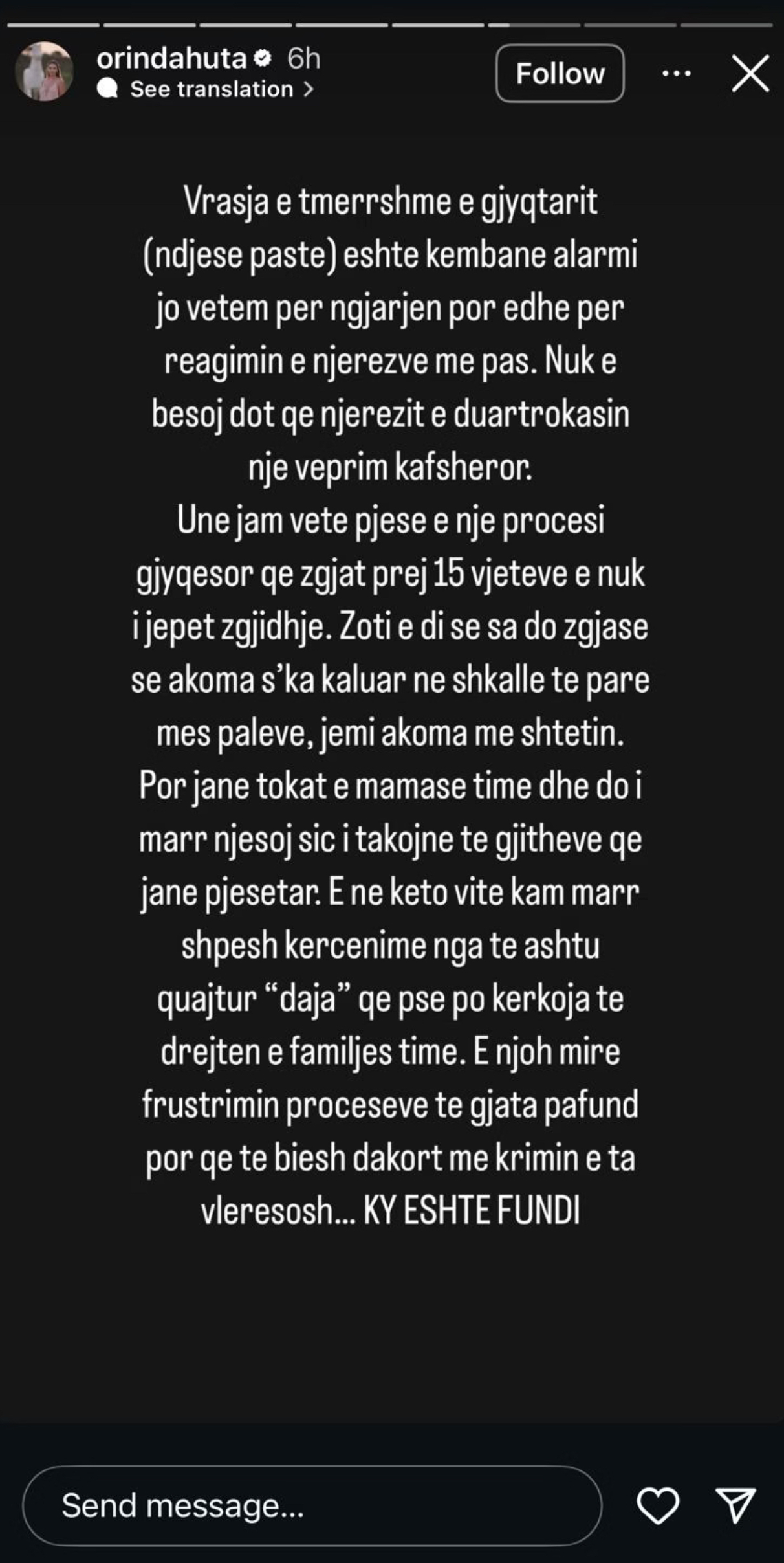 “Nuk e besoj dot që njerëzit duartrokasin një veprim kafshëror. Vrasja e tmerrshme e gjyqtarit është një kambanë alarmi, jo vetëm për ngjarjen, por edhe për reagimin e njerëzve më pas”, shkroi ajo, duke theksuar se mungesa e empatisë dhe gëzimi për një akt makabër tregojnë një shoqëri që po humbet ndjeshmërinë njerëzore.