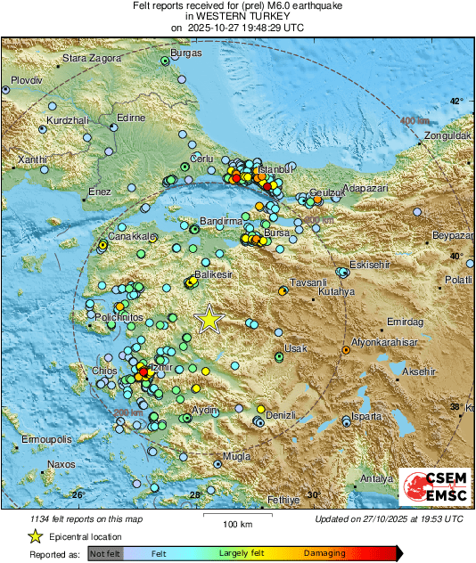 Presidenca e Menaxhimit të Fatkeqësive dhe Emergjencave, njoftoi se lëkundjet u ndjenë gjerësisht në Izmir, Bursa, Stamboll dhe Tekirdağ, ndërsa disa ndërtesa në Sındırgı janë shembur.