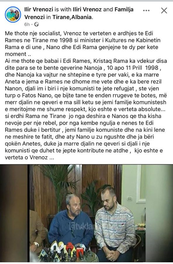 “Babai i Edi Ramës, skulptori Kristaq Rama, kishte ndërruar jetë më 10 ose 11 prill 1998. Në ditët e vakisë, Fatos Nano shkoi në shtëpinë e tyre për ngushëllim. Aty ndodhi gjithçka,” – tregon socialisti i cituar nga Vrenozi.