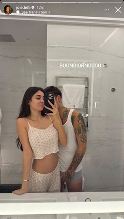 Së fundmi, ajo ka publikuar një foto në InstaStory, ku shfaqet para pasqyrës së tualetit me pizhama, ndërsa në krah të saj qëndron këngëtari i njohur italian Fred de Palma.
