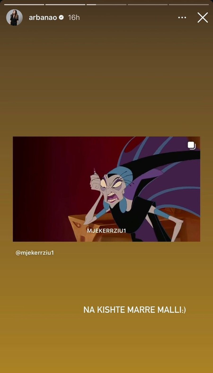 Pas kësaj, Arbana Osmani reagoi në mënyrën e saj karakteristike — pa përmendur askënd drejtpërdrejt, por duke dhënë një mesazh të qartë përmes humorit dhe ironisë. Moderatorja publikoi në InstaStory një video montazh të realizuar nga faqja satirike @mjekërrziu1, ku përzihen fragmente nga emisione televizive me personazhe të animuar. Në këtë montazh, zëri i Elsa Lilës është vendosur mbi kukullën Izma — antagonisten kryesore në filmin vizatimor “The Emperor’s New Groove” (“Çmenduritë e Perandorit Kusko”) — e njohur për karakterin e saj të ashpër dhe manipulues.