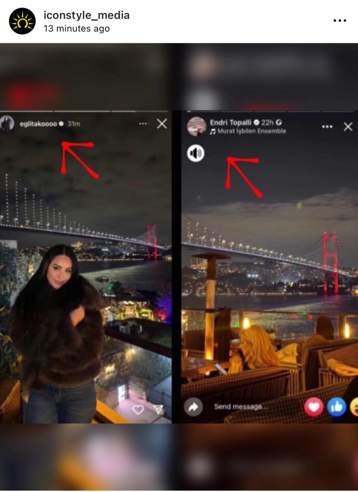 Gjithçka ka nisur nga disa postime në Instagram, ku të dy duket se ndajnë pamje nga vende pothuajse identike — fillimisht nga makinat respektive në trafik, e më pas nga i njëjti ambient luksoz me pamje nga ura e Bosforit në Stamboll. Ndjekësit vunë re detaje të përbashkëta, si këndet e fotove, oraret dhe lokacionet, duke ngritur dyshime mbi një udhëtim të përbashkët.
