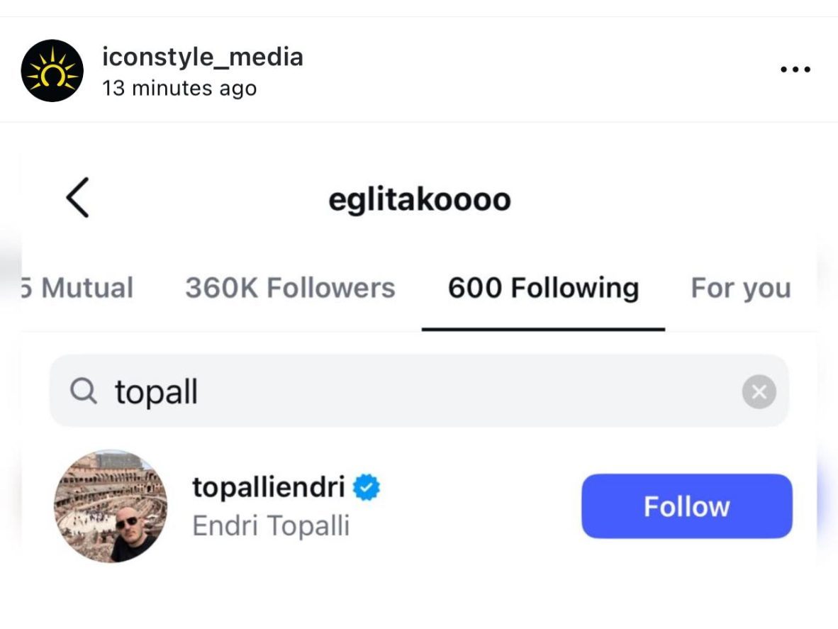 Për më tepër, në profilin e Eglit vihet re se ajo ndjek Endri Topallin në Instagram, fakt që ka shtuar edhe më shumë “benzinë në zjarr”. Komentet e ndjekësve nuk kanë munguar, teksa spekulimet janë shtuar duke pyetur nëse mes tyre ka lindur një marrëdhënie.