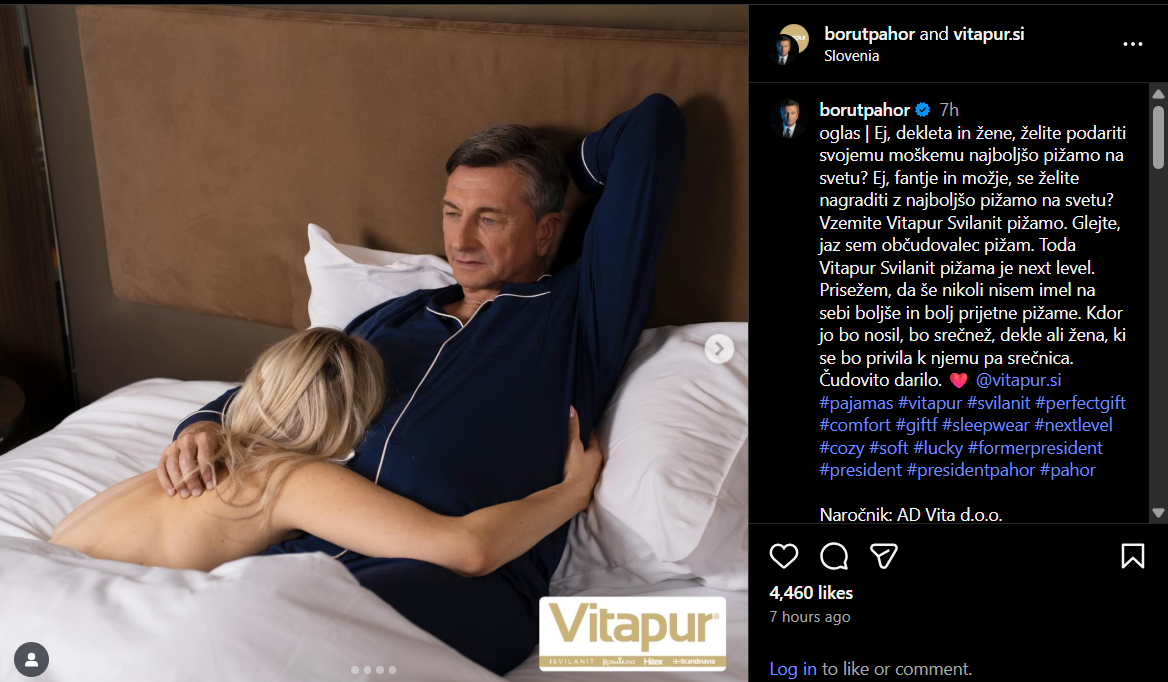 Ish-presidenti slloven Borut Pahor ka tërhequr sot vëmendjen e mediave rajonale dhe opinionit publik, pasi publikoi një set fotografish të shkrepura gjatë xhirimit të një reklame komerciale, ku ai shfaqet si protagonist. Fotot u postuan fillimisht në profilin e tij zyrtar në Facebook Inc. dhe Instagram, duke shkaktuar reagime të menjëhershme, shpërndarje virale dhe mijëra komente nga përdorues shqiptarë, sllovenë, kosovarë e maqedonas.