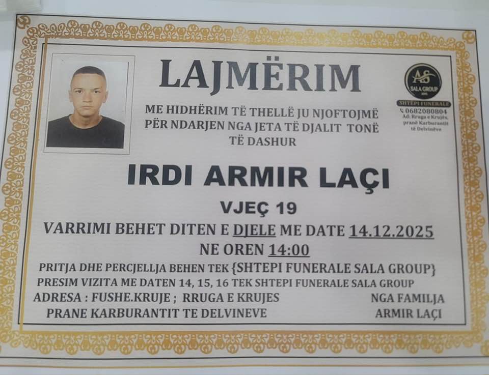 Personi në foto është 19-vjeçari Irdi Laçi, i cili humbi tragjikisht jetën mbrëmjen e djeshme në daljen e Fushë-Krujës. Ai po shtynte një automjet të tipit “Mercedes” që kishte ndaluar në mes të rrugës, kur u përplas nga një fuoristradë që po kalonte.