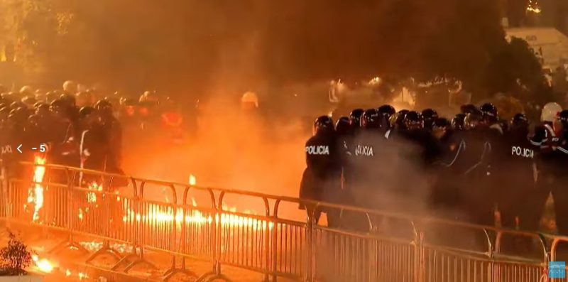 Protestuesit hodhën molotovë dhe fishekzjarrë drejt godinës, ndërkohë që policia iu kundërpërgjigj me ujë dhe gaz lotsjellës.
