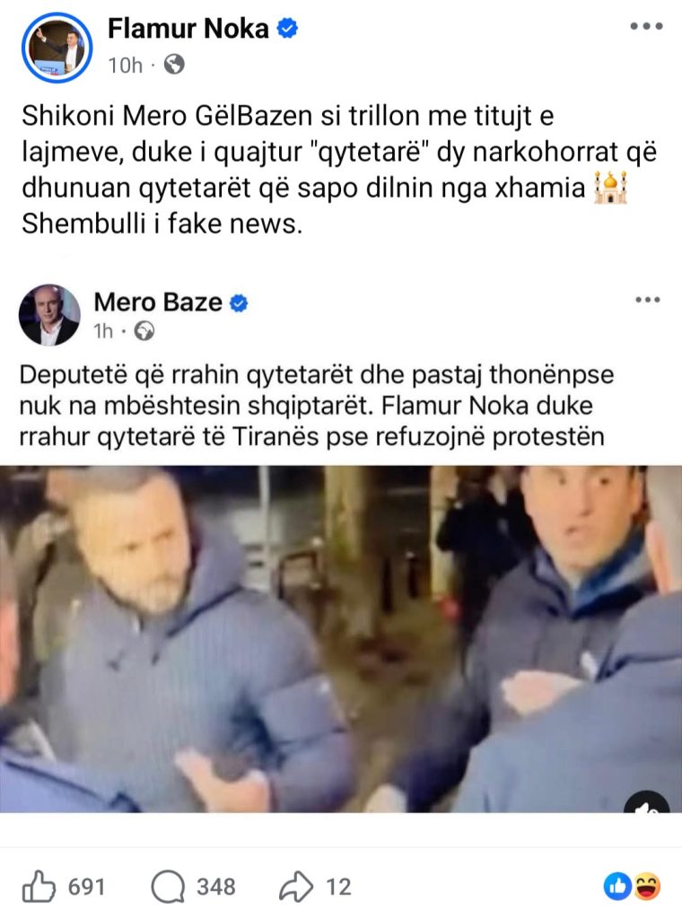 Gazetari Mero Baze dhe Sekretari i Përgjithshëm i PD-së, Flamur Noka, janë përfshirë sot në replika dhe akuza të ndërjsella. Mero Baze ka publikuar videon ku Flamur Noka dhunon qytetarin Tetem Toraj, duke e pandehur si agjent policie. Baze shkruan se Noka po dhunonte qytetarë të Tiranës, të cilët refuzonin protestën e Sali Berishës për rrëzimin e qeverisë me grupin e molotovit.